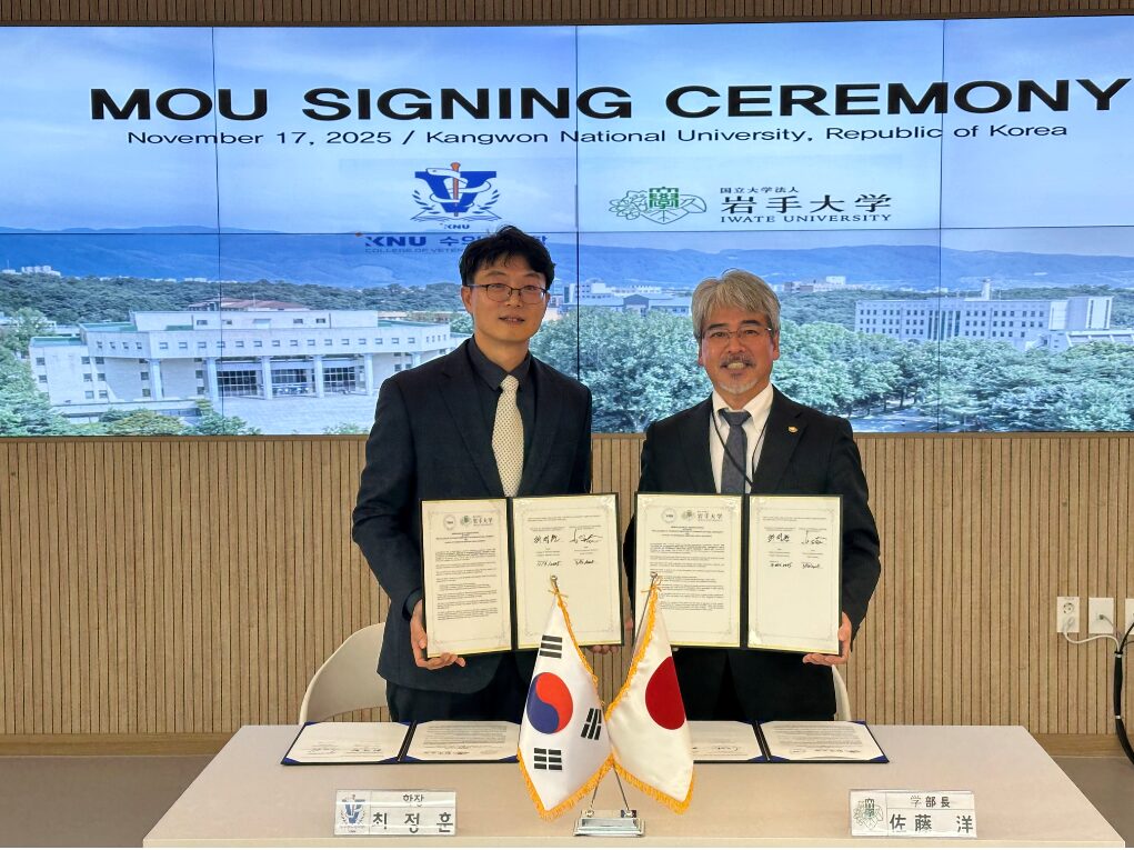 2025年11月17日、韓国江原大学において協定締結式が挙行され、岩手大学獣医学部の佐藤洋学部長、江原大学獣医学部のチェ・ジョンフン学部長がそれぞれ協定書に署名しました。